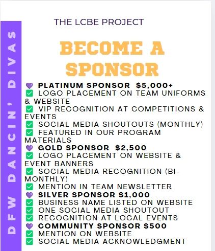 At DFW Dancin’ Divas, we believe in building confidence, discipline, and excellence in our young dancers. As a sponsor, you are not just supporting a team—you’re investing in the future of talented, driven youth who are striving for greatness. Your sponsorship will help provide essential resources, ensuring every dancer has the opportunity to thrive, regardless of financial barriers.